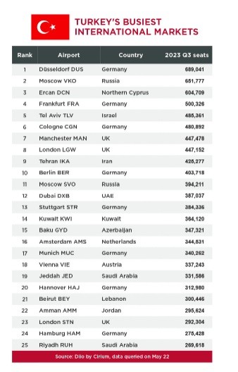 İşte Cirium’un çalışmasına göre 3. çeyrekte Türkiye’ye ve Türkiye’den en fazla koltuk kapasitesinin sunulduğu 25 uluslararası havalimanı: