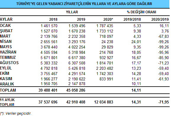 Ocak-Kasım onbir aylık verilere bakıldığında ise 2020 yılında ülkemizi ziyaret eden yabancı ziyaretçi sayısı 12,03 Milyon olurken, geçen yıl bu sayı 42.91 Milyon idi. Böylelikle onbir aylık ziyaretçi kaybı yaklaşık 31 Milyon ve % 72 olarak gerçekleşti.