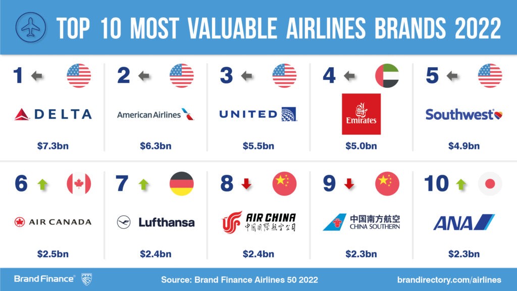 Bu üç Amerikan devini, 5 milyar dolar ile Emirates, 4.9 milyar dolar ile Southwest Airlines, 2.5 milyar dolar ile Air Canada takip etti. Alman Lufthansa ve Air China yaklaşık 2,4 Milyar Dolarlık değerleriyle yedinci ve sekizinci sırayı aldılar. China Southern ve ANA dokuz ve onuncu sırada listeyi tamamlıyorlar.