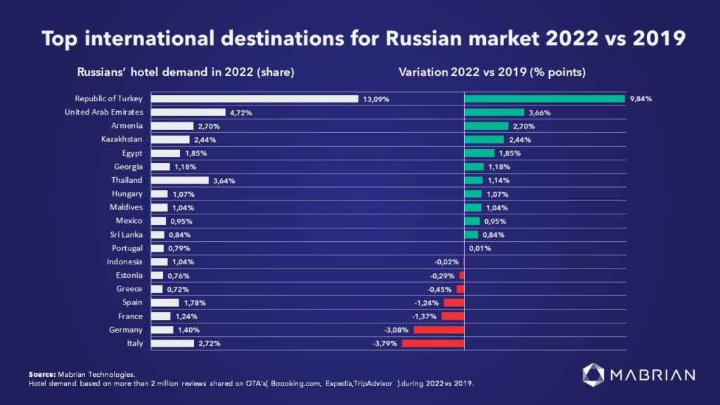 Mabrian’ın çalışması, 2022 yılında dünya genelinde 700’den fazla destinasyonda Rus gezginlerin otel talebinin ve ortalama otel odası fiyatının 2019 trendleriyle karşılaştırılmasına dayanıyor.