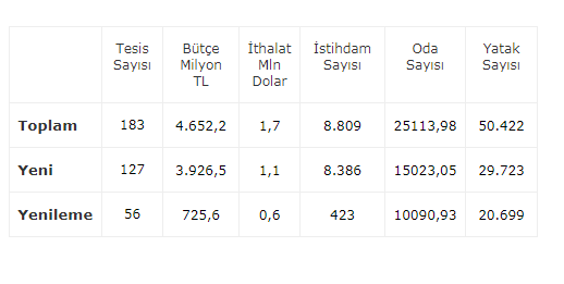 Sektörün yatırım projelerinden 127 adedi ile 3,92 milyar TL bütçeli yeni oteller yapılacak. 56 adet tesis de yenileme, tamamlama ve tevsi gibi amaçlarla 725 milyon TL’lik bütçe ayırdı.