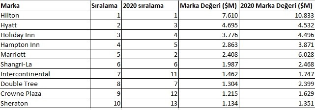 Araştırmaya göre dünyanın en değerli 50 otel markasının toplam değeri, 2020’de 70,2 milyar dolardan 2021’de 47,4 milyar dolara düşerek yıllık %33 düşüş gösterdi.