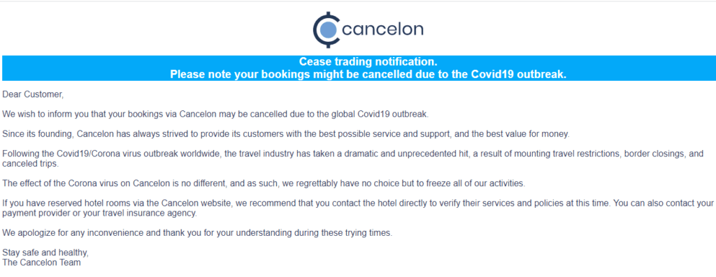 “Cancelon üzerinden yapılan rezervasyonlarınızın küresel Covid19 salgını nedeniyle iptal edilebileceğini bildirmek istiyoruz.