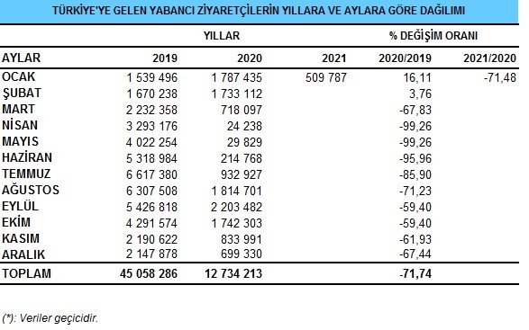 Verilere göre Ocak ayında ülkemize 509.787 yabancı ziyaretçi gelirken bu sayı Aralık ayında yaklaşık 700 bin idi. 2020 nin Ocak ayında ise ülkemize gelen yabancı ziyaretçi sayısı 1,79 Milyon idi.