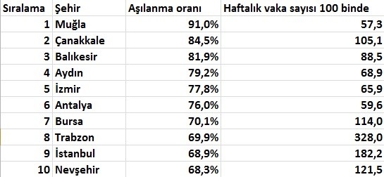 Haftalık vaka sayısında ise Muğla 100 bin nüfusta 57,3, Antalya 59,6, İzmir 65,9, Aydın 68,9, Balıkesir 88,5 ile ilk sıralarda yer alıyor.