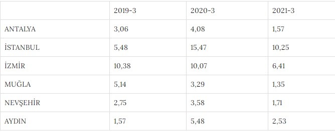 Toplam kredilerde 2019 yılında % 38,5 payla lider olan İstanbul, 2021 yılında % 33’e kadar geriledi. Antalya’nın payı % 36,3’ten % 41,6’ye yükseldi.
