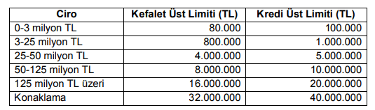 Yararlanıcı başına kefalet üst limiti 32 milyon TL ve kredi üst limiti 40 milyon TL olarak duyurulurken kredi ve kefalet limitleri ciro aralıklarına göre aşağıdaki şekilde belirlendi: